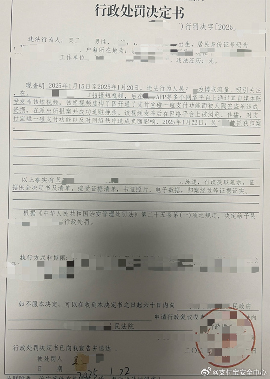 事件起因于2025年1月中旬,部分自媒体发布视频,声称用户在使用支付宝“碰一下”支付功能时,资金被隔空盗刷。这些视频迅速引发公众关注。从目前发布的消息来看,有关机构已对造谣者出具行政处罚决定书。1月23日,已有博主对虚构自媒体内容发布致歉声明。